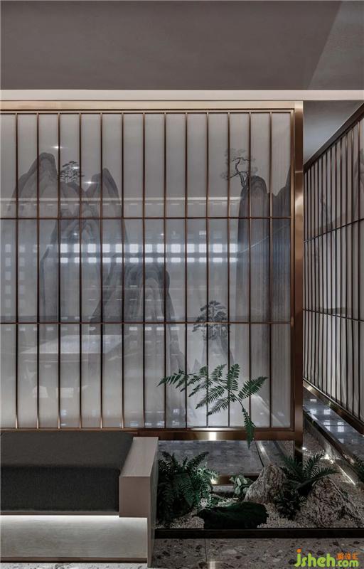 隨之撲面而來(lái)的是設(shè)計(jì)中以當(dāng)代手法將山水、自然和光影結(jié)于一庭,整個(gè)空間由一幅美輪美奐的長(zhǎng)廊絹紗定制的水墨山水畫(huà)卷串聯(lián)起來(lái),經(jīng)典的符號(hào)、現(xiàn)代的工藝、清雋簡(jiǎn)潔的藝術(shù)與文人雅士的生活場(chǎng)景交疊融合,寥寥數(shù)筆,東方的清雅與靈逸緩緩而入。