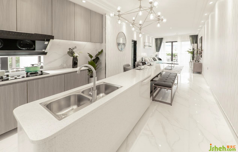 開放式空間設計,令書房、廚房、餐廳、客廳四區(qū)一體化,設計師靈活地利用空間布局,劃分各區(qū)的功能性作用,增加了儲物功能,使得空間看起來非常整潔干凈。而且整體米白色色調(diào)為鋪墊,金屬材質(zhì)點 綴,營造一種輕盈透亮的時尚感,不失個性,兼具品味與高貴。