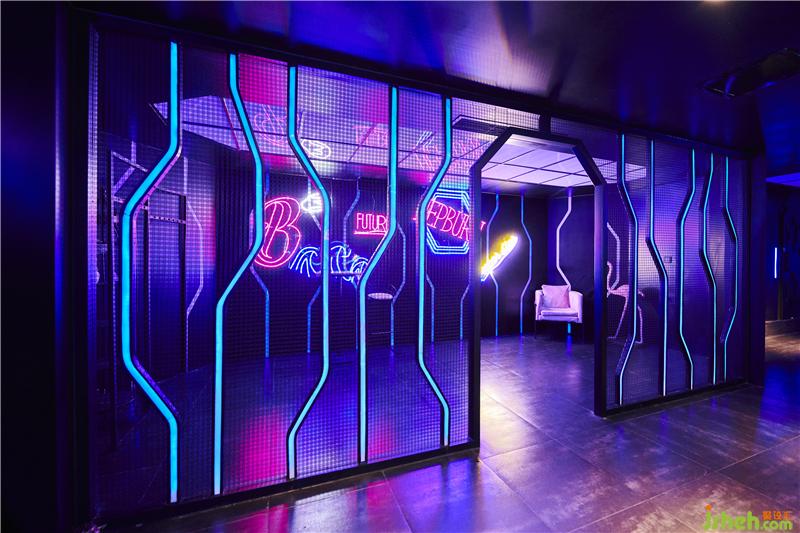 包廂區(qū)域設(shè)計師大面積地采用流行尖端的宇宙藍(lán)和太空白,運用體塊疊加,與材料的有趣排列制造一種時空隧道的空間質(zhì)感,利用時間穿梭的設(shè)計概念、線條幾何圖形、環(huán)境燈光等設(shè)計元素將天花、墻面、地面有機(jī)結(jié)合,結(jié)合動態(tài)光效,賦予空間極強(qiáng)的韻律感。