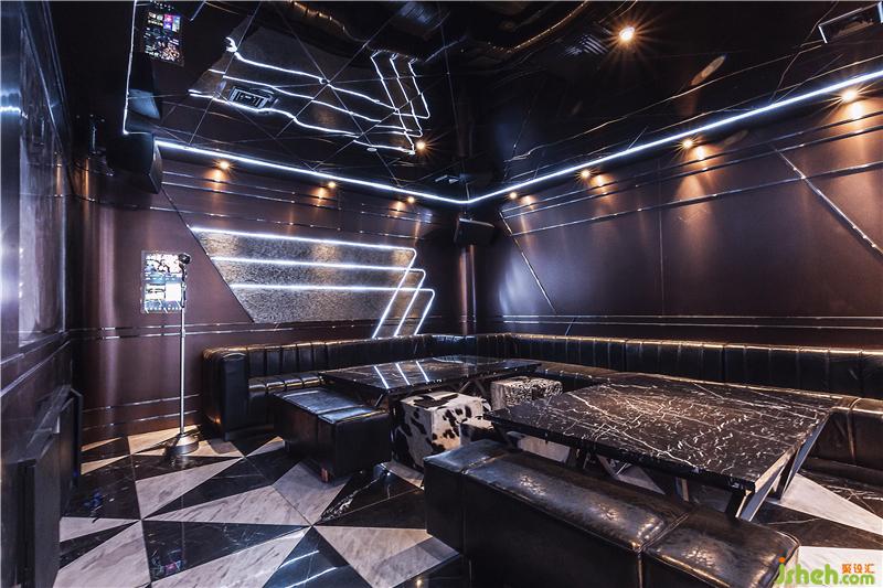 設(shè)計(jì)風(fēng)格的主調(diào)偏夜店風(fēng),設(shè)計(jì)師從“9plus”Logo原型中獲得創(chuàng)意啟發(fā),衍生出墻面、地拼、天花吊頂皆選用折線、硬朗元素。