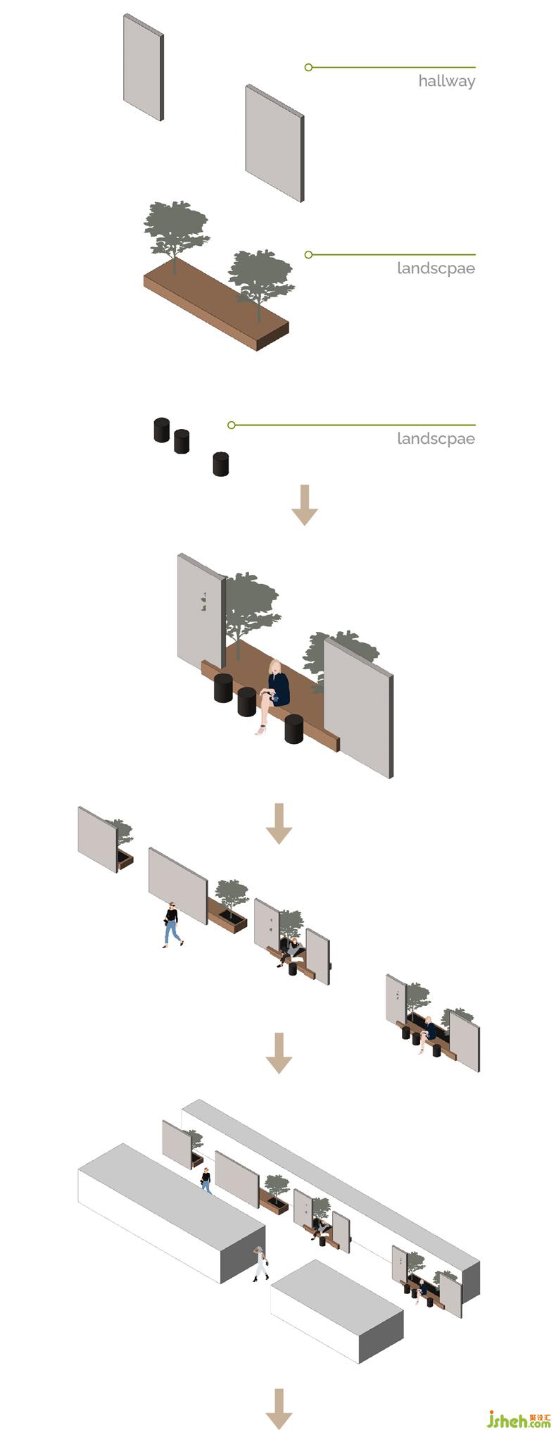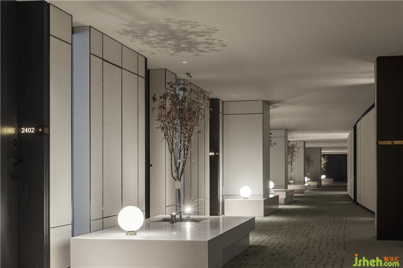 客房過道區(qū)域,設(shè)計(jì)師大膽地提出客房內(nèi)退的形式,犧牲客房的空間,以迂回式的入門儀式,通過門口的景觀、屏風(fēng),不同組合方式圍合出獨(dú)立小庭院,與外界隔絕,構(gòu)成廊道街區(qū)效果,制造美好的體驗(yàn)感與私密性