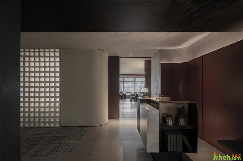 設(shè)計(jì)師將連接貫穿兩側(cè)過廳的廊道,擴(kuò)展為標(biāo)準(zhǔn)公區(qū)的外延,在此開辟出供住戶們品嘗茶點(diǎn)、酒店設(shè)計(jì)閱讀放松之用的餐廳,升級酒店顧客體驗(yàn)。廊道兩側(cè)入口的玻璃屏風(fēng),增強(qiáng)私密性與儀式感;天花的構(gòu)造運(yùn)用古典建筑手法,以弧度元素與高級質(zhì)感為整個(gè)空間定下“建筑藝術(shù)”的基調(diào)