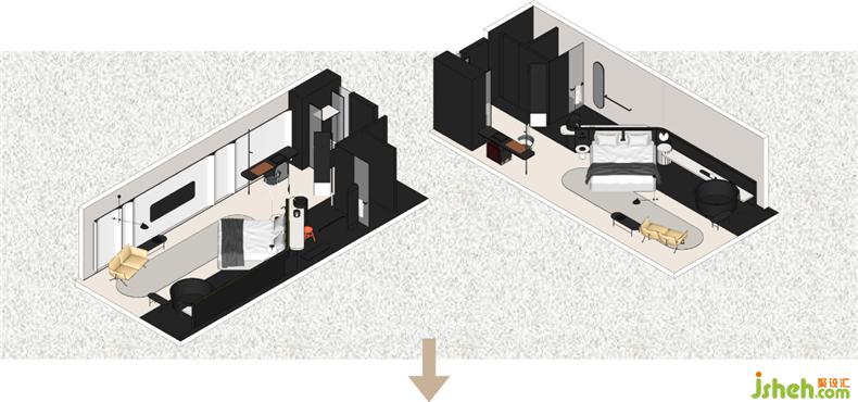 標(biāo)間吊頂造型致敬經(jīng)典的建筑元素,用半弧的建筑體塊去塑造頂面,使空間“建筑感”十足,硬裝的柔和與硬朗形成對(duì)話