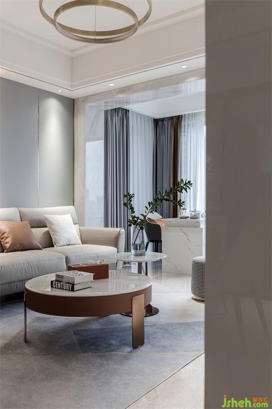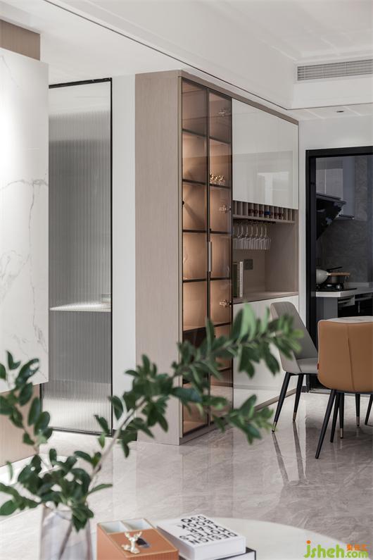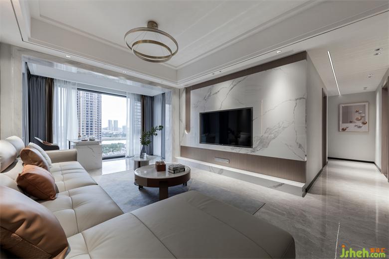 魚肚白巖板電視背景與溫潤(rùn)柵格木板的有機(jī)組合,以材質(zhì)的碰撞出“美”的樣性。