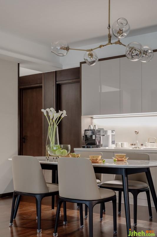 根據(jù)功能需要設(shè)計(jì)師將櫥柜設(shè)立為上下兩層,上柜的高度使得頂端與天花板之間產(chǎn)生“留白”的效果,減少其壓迫感。