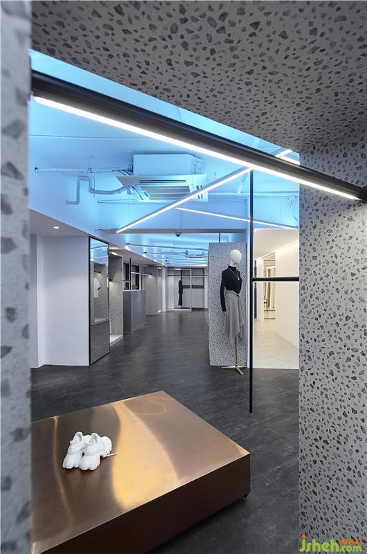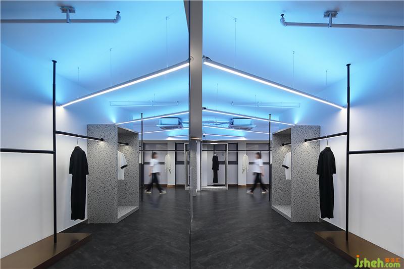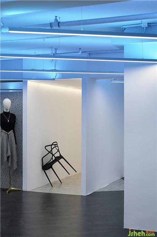 與試衣間鄰近相隔設(shè)有一條狹長的矩形通道,設(shè)計師亦是運用了景觀設(shè)計之中移步換景的方法,賦予其蛻變之道的魂魄。