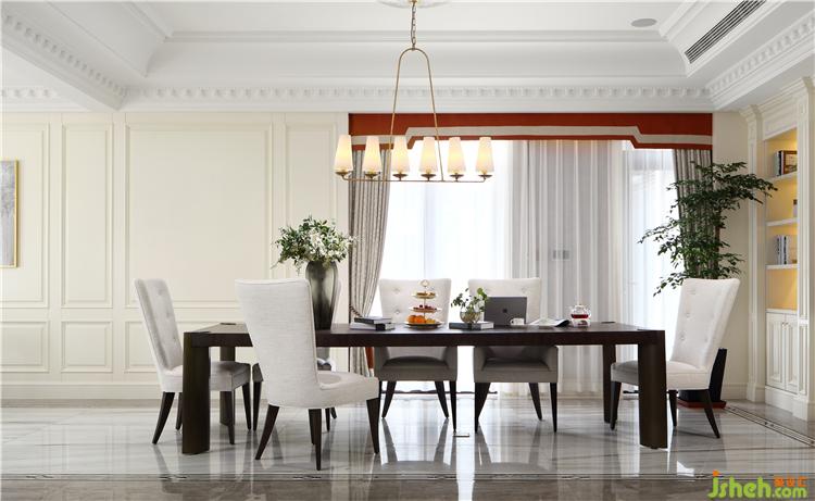 寬敞的起居室由米白色的墻板包層,同時還有一些定制的展示柜,將跳躍的橙色單椅、淺灰地毯以及干凈的白色布藝融合在一起。一旁的餐廳里,深色的胡桃木桌和布藝餐桌凳使得餐廳看上去高雅而干凈,加上做舊而狹長的吊燈點綴,更顯得別致。別墅裝飾