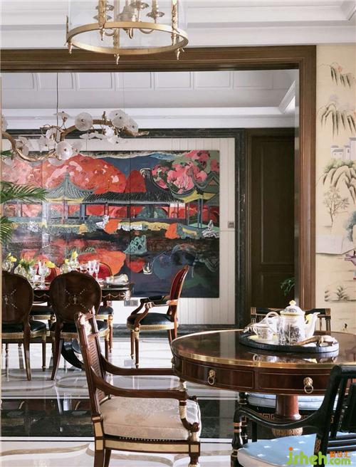 同樣在餐廳的設(shè)計(jì)中,豪宅裝修設(shè)計(jì)也選擇了一幅漆畫,但是另行其道,使用了一些當(dāng)代油畫的畫法,用整體的色彩感和意境美的表達(dá)呈現(xiàn)出當(dāng)代元素,濃烈的色彩感與餐廳的會(huì)客氛圍和食欲遙相呼應(yīng)。精致的燈具在餐廳中的布置也是點(diǎn)睛之筆。