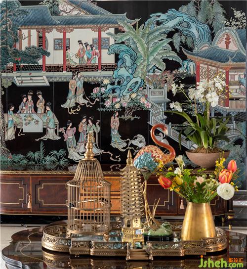 對于客廳的穩(wěn)重大氣,文化的元素要得以呈現(xiàn),于是針對墻壁的掛畫室內(nèi)設(shè)計(jì)師特意找藝術(shù)家定制了一幅中式傳統(tǒng)漆畫,在漆畫的內(nèi)容上使用了中國傳統(tǒng)的工筆畫法表現(xiàn),力求場景的豐富度、中西方文化的交融的感覺。