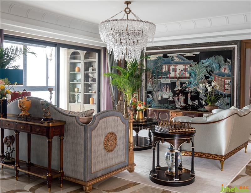 家的整體格調(diào)為文化多元化的混搭和藝術(shù)化的呈現(xiàn),力求在經(jīng)典元素、文化元素、當(dāng)代元素中得以體現(xiàn)。在家中的每一件物品都能體現(xiàn)出他們一家對于生活品質(zhì)和精致的追求。入門穿過玄關(guān)便是客廳和開放式餐廳,旁邊是家的各個(gè)房間,里面是廚房。豪宅裝修設(shè)計(jì)