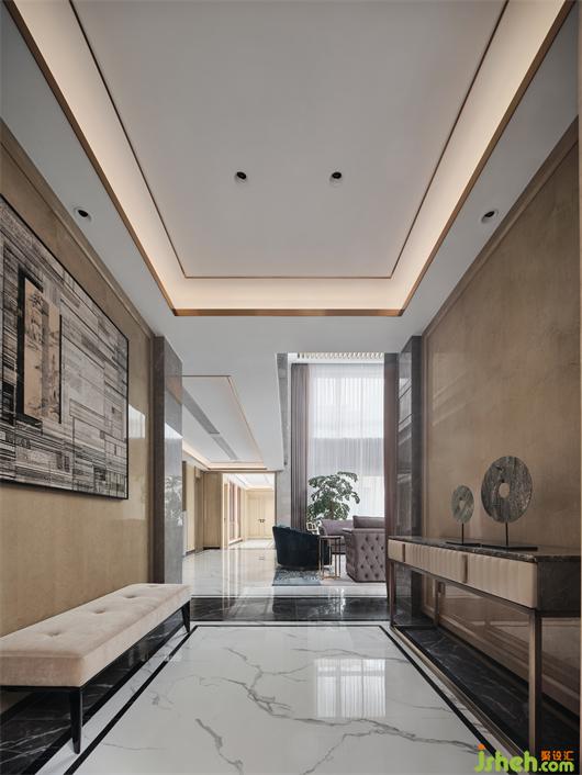 客廳頂部融入中國傳統(tǒng)建筑的房檐元素,一面一角是凝結(jié)的藝術(shù),一尺一寸是生動的風景。整體軸對稱的設(shè)計手法,讓線條如陣列端直,經(jīng)歷四季洗禮,守護一方歲月靜好。