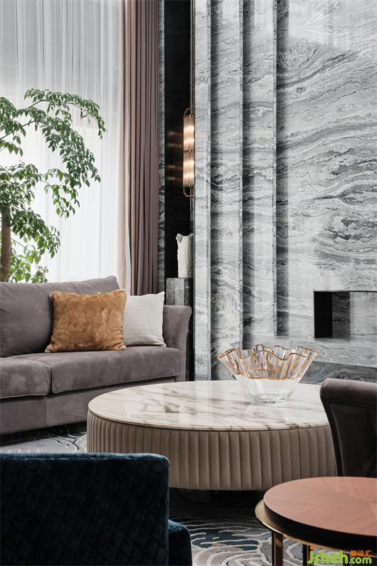 會客區(qū)域的設(shè)計,給人以安定。以經(jīng)典藍白灰為基調(diào),鋪設(shè)大面積樹木年輪紋理地毯,渲染安靜的氛圍。有朋遠來,不亦樂乎,邀至廳堂,客人上坐,主人陪同,清茶點心,談笑風生。