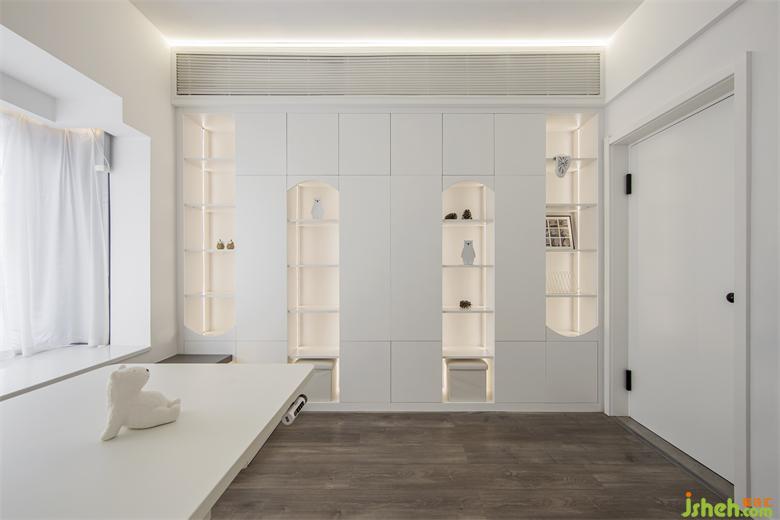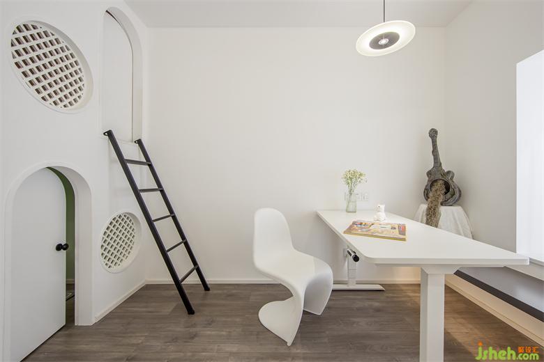 入戶與多功能房:入戶對(duì)立的隱形門和白墻融為一體,將視線引向敞亮的客廳的同時(shí),又對(duì)其門后功能房產(chǎn)生探尋之意,聚集了辦公、閱讀、兒童娛樂(lè)的功能間,階梯的建構(gòu)和小閣樓的打造,相映室內(nèi)設(shè)計(jì)成趣。