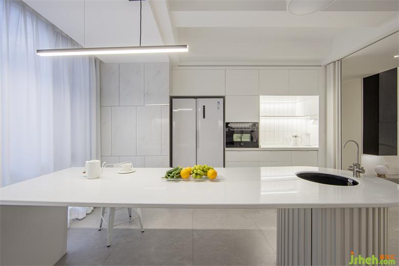 餐廚:打通陽(yáng)臺(tái),開放式的餐廚一體間,中西餐櫥柜坐立兩邊,長(zhǎng)圓弧導(dǎo)臺(tái),讓視覺和行動(dòng)更開闊。真假小頂梁的弧度弱化,整體建室內(nèi)設(shè)計(jì)立了主操作區(qū)域的輪廓。窗邊就餐區(qū)的長(zhǎng)條燈承上啟下,即食人間煙火。