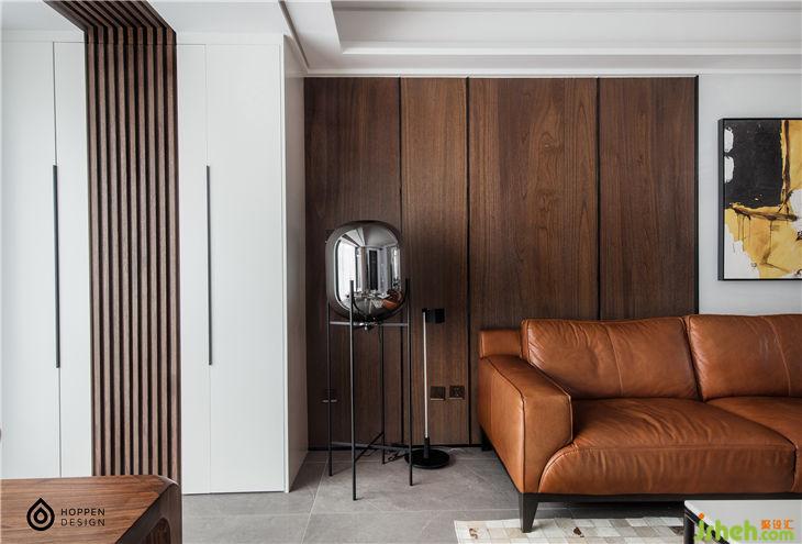 整個空間采用免漆木飾面,它有著傳統(tǒng)木飾面難以比擬的特性,它所見即所得,紋理細膩自然,不用再做漆,紋理色澤可控,也更加的環(huán)保清新。電視背景下的爵士白大理石經(jīng)加工研磨讓無暇的理石表面凸顯質(zhì)感,與深咖色的木紋相互碰撞形成鮮明的對比。