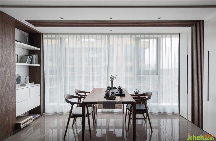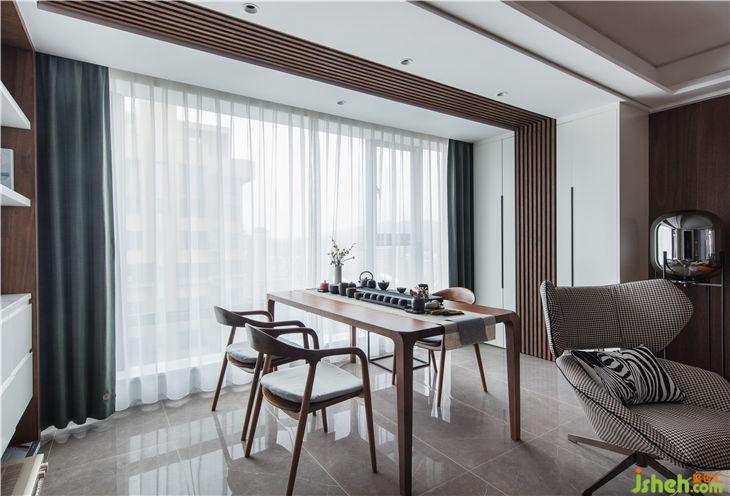 泡茶區(qū)的木柵格從柜體貫穿至吊頂,連續(xù)性延伸使的空間感凸現(xiàn)出來。陽光透過白色的紗簾,配合墨綠色簾布,緩緩的時光安靜又祥和。
