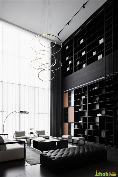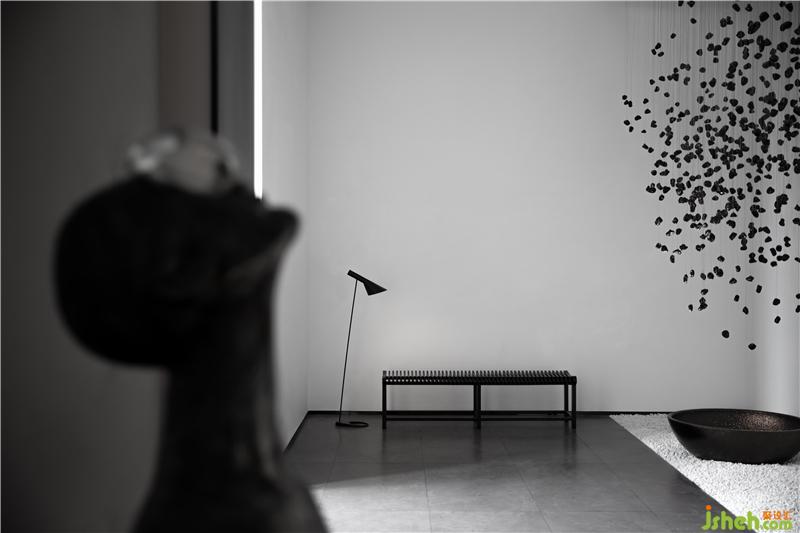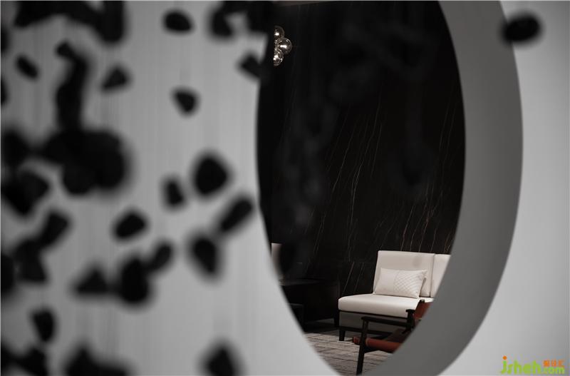 從前廳進(jìn)入玄關(guān),造景與造境,無數(shù)黑色石子從天而降,回歸于一圓盤,寓意“萬物歸一”,順著動線的引導(dǎo),進(jìn)入產(chǎn)品體驗空間后,體驗者藉由移動、視野、猜想,與空間產(chǎn)生互動能量。重新以美學(xué)的展現(xiàn)存在于空間序列之中,構(gòu)建起純粹且順應(yīng)建筑優(yōu)勢的室內(nèi)空間邏輯。
