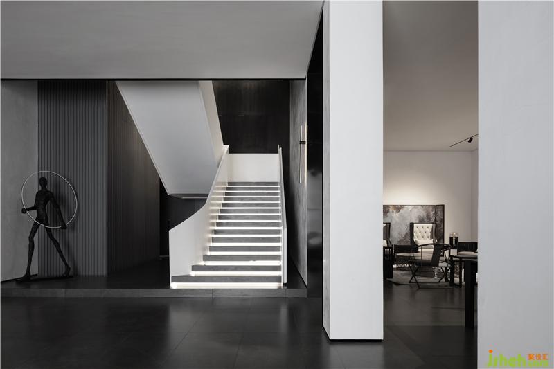 利用網(wǎng)格元素墻隔出相鄰的功能區(qū)間,調(diào)節(jié)漫游動線的心境,另外空間一面黑白林間雪景燈箱畫呈現(xiàn),在空間中不同溫度的感受,保證了簡約空間的視覺一致性。