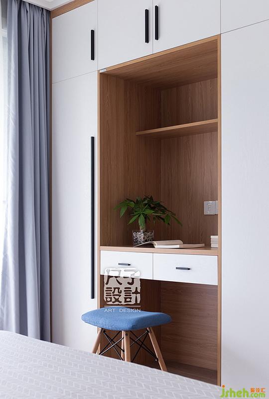 恬靜淡然的主臥,以麻質(zhì)墻紙舒張了空間的視覺效果,硬朗造型的整排衣柜中內(nèi)嵌梳妝臺(tái),最大限度的讓房子“好用”起來。