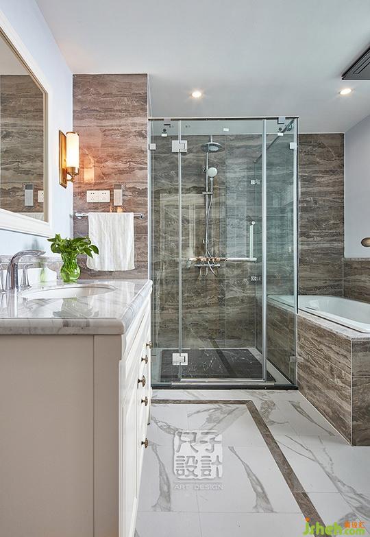 淋浴與浴缸以透明玻璃作為隔斷,實現(xiàn)完美的互存;褐色紋理的大理石墻面,讓沐浴區(qū)與洗手臺有了巧妙的區(qū)分。