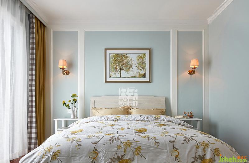 素凈的粉藍色墻面配上淺黃床品,次臥空間清新明媚。