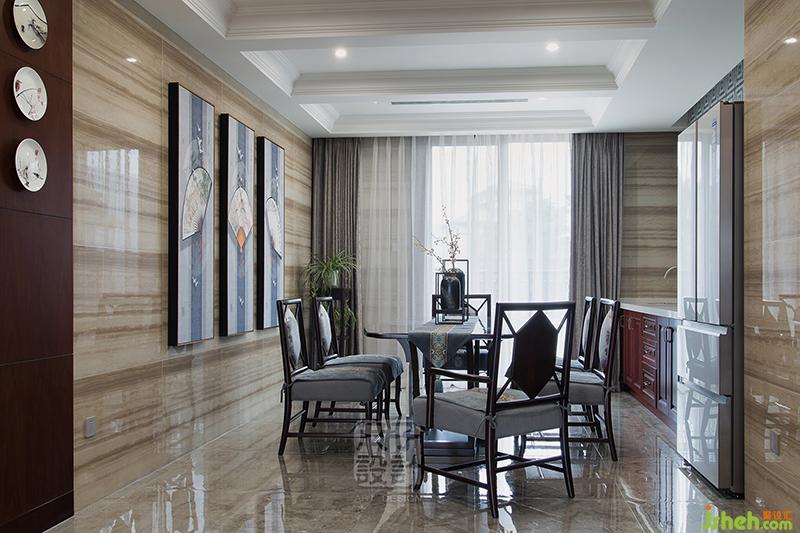 信步走向餐廳,兩邊的木色將人環(huán)繞在其中,鏤空隔斷與雕花矮柜訴說著中式的精彩。