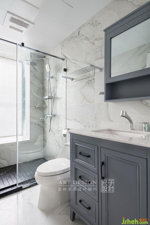 干凈透亮的石紋瓷磚,與灰藍(lán)色浴室柜,打造簡(jiǎn)約實(shí)用又不失質(zhì)感的衛(wèi)生間。