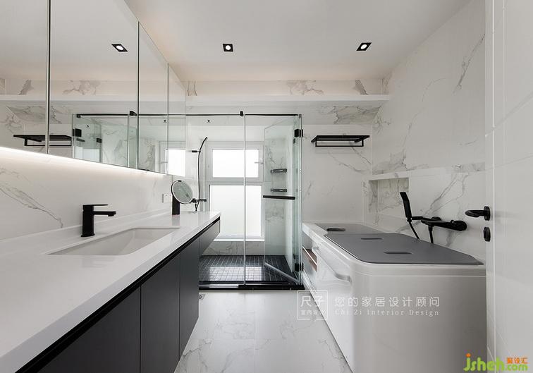 黑色的浴室柜搭配紋理曼妙的大理石紋,打造簡潔實用的主衛(wèi)空間;我們在活動浴缸右上方做了壁龕,方便放置洗浴用品。