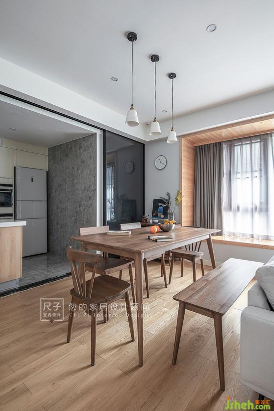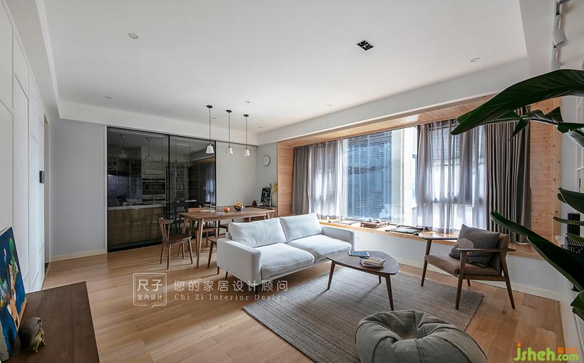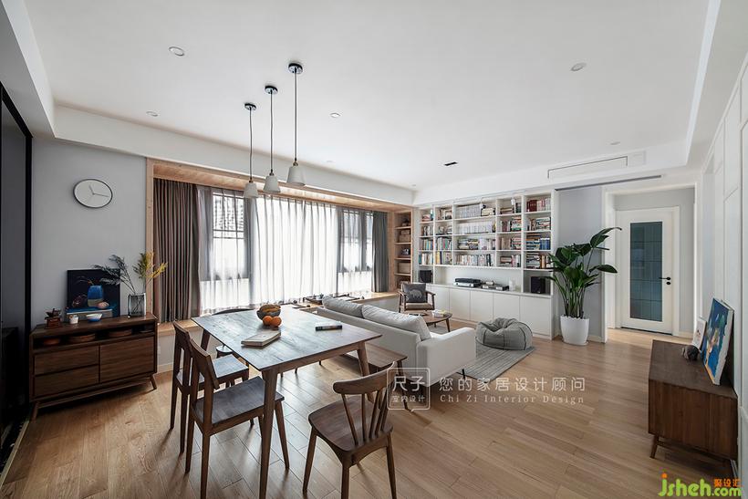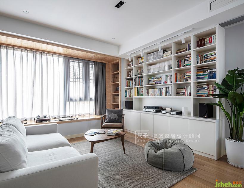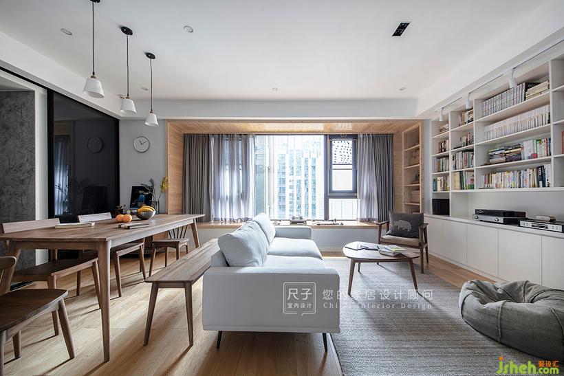 由玄關(guān)步入,客餐空間一覽無余,拋棄了傳統(tǒng)的電視布局;長長的飄窗,占據(jù)著家中最顯眼的位置,與一旁的書架墻構(gòu)成了這個家的核心區(qū)域。設(shè)計公司
