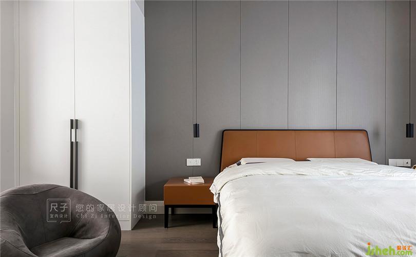 主臥床頭面積較寬,我們以縱向分割的硬包造型來改善視覺表現,同時用垂落的兩盞吊燈營造溫暖的氛圍感。