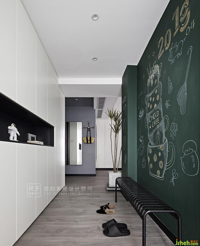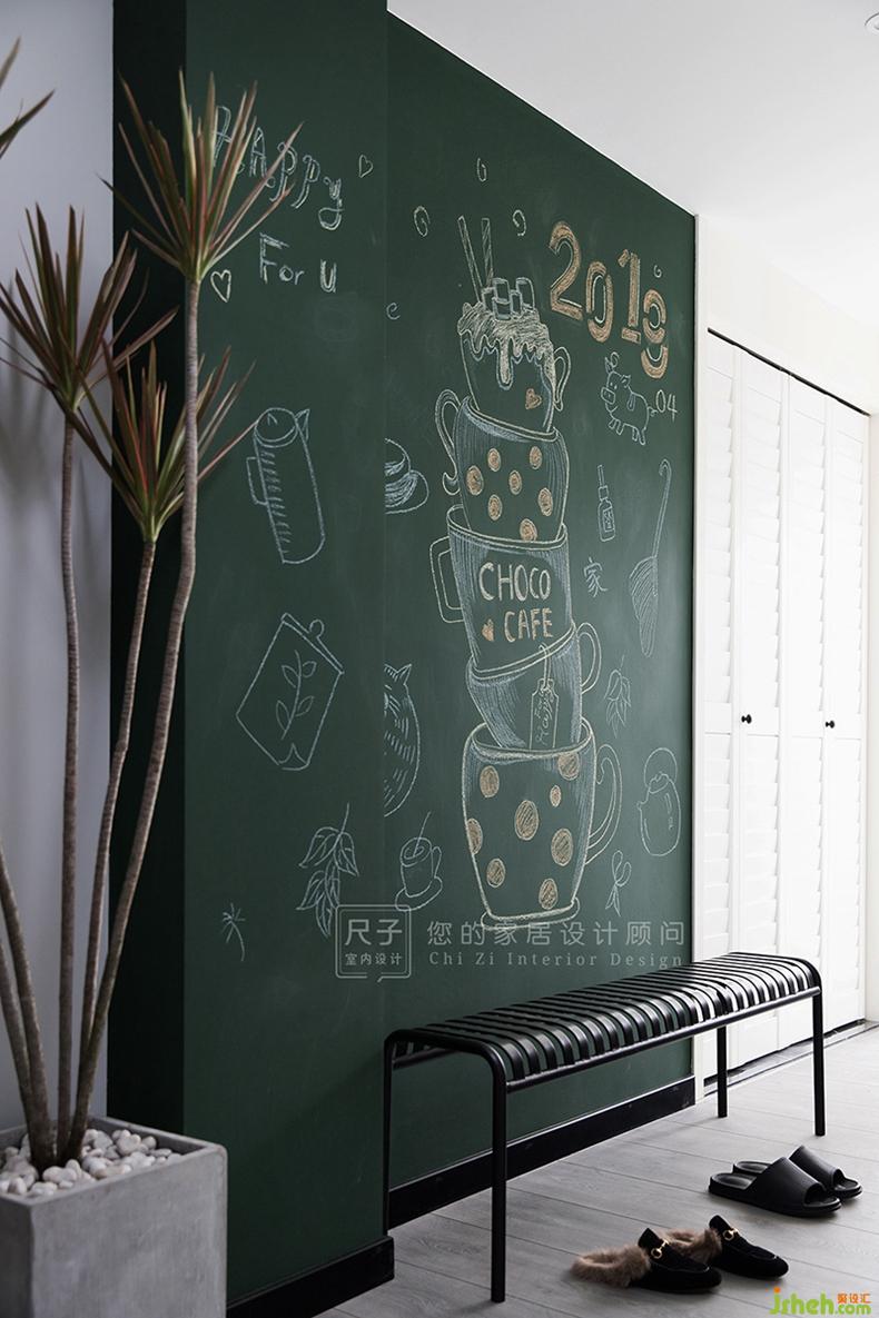玄關(guān)空間是實用與藝術(shù)的交界地,到頂?shù)男P(guān)柜承載著這個家的收納重任;右側(cè)的黑板墻則是用來記錄一家人溫馨的點滴。深圳設計公司