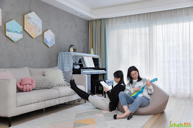 本案例以F小姐喜愛的馬卡龍色系為主色,通過對色彩的巧妙把控,以低飽和度的對比色碰撞,還原F小姐心中:詩意、夢幻、溫暖的家。