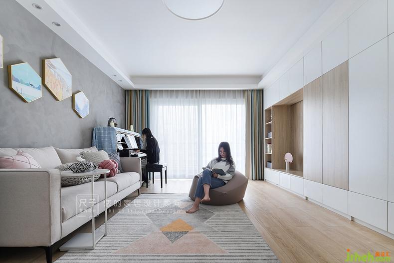 進(jìn)門左拐,就是客廳空間,水泥灰藝術(shù)涂料的沙發(fā)背景,不均勻的灰色以及自然涂刷的痕跡,也變成獨到的風(fēng)景。深圳設(shè)計公司