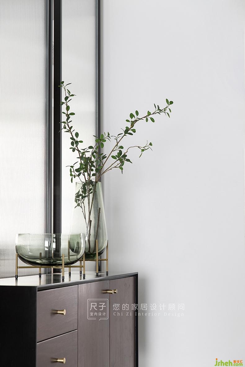 長(zhǎng)虹玻璃與胡桃木色矮柜構(gòu)成這個(gè)家的入戶端景。深圳設(shè)計(jì)公司
