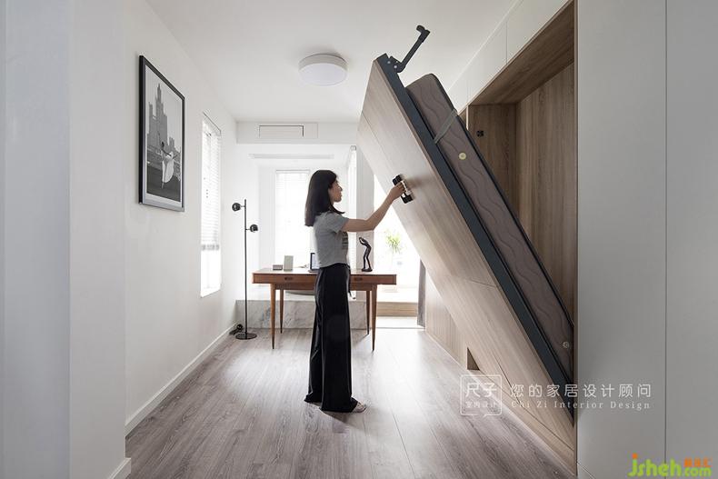 透光折疊門(mén)打造通透空間感,易移動(dòng)的書(shū)桌椅以及隱形壁床讓書(shū)房承擔(dān)起客臥的功能。
