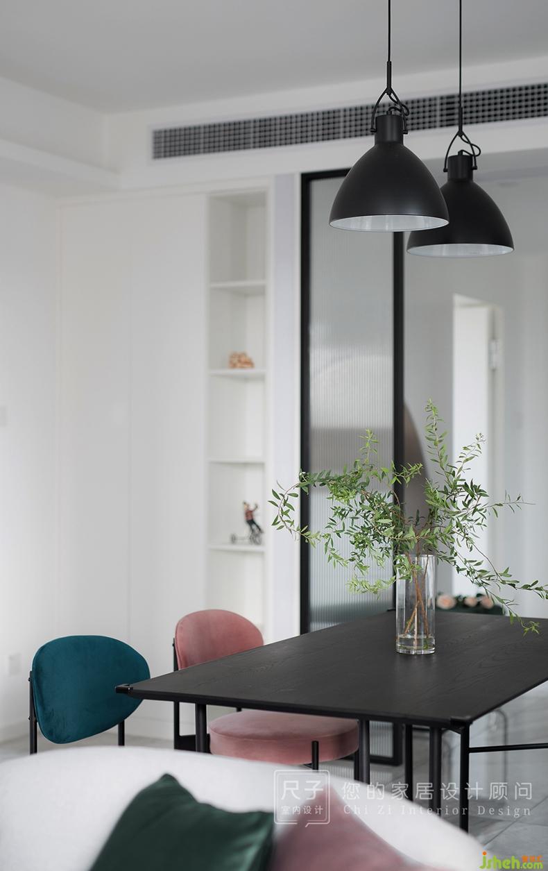 為了營造客餐廳的通透感,室內(nèi)設(shè)計師以大面積的白色來點亮整個空間,臟粉以及墨綠等點綴色的碰撞,像是雨水裹挾櫻花飄落在地,讓空間呈現(xiàn)時尚質(zhì)感。