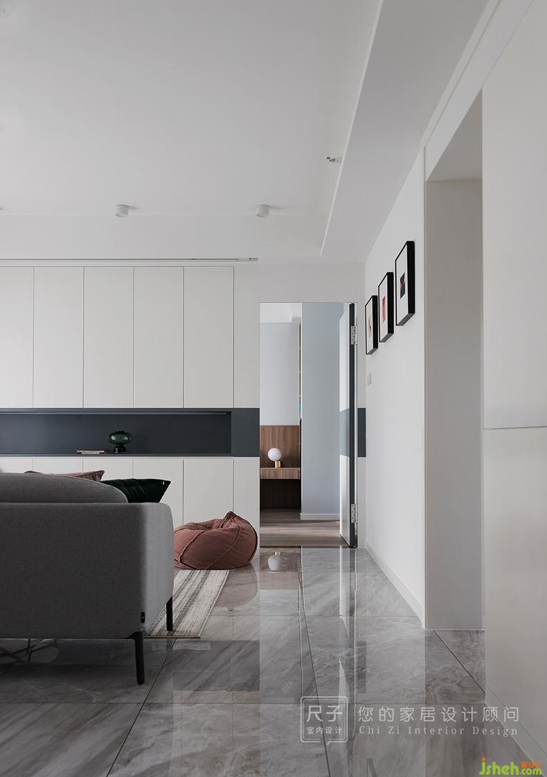 隱形門設(shè)計讓客廳與主臥既相互獨立又不失為一個整體,太空灰開放格橫向延伸,成為白色塊面中的線型點綴,給空間帶來富有變化的靈動感。