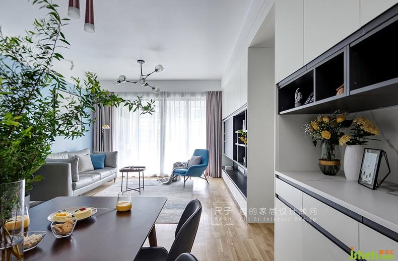 從餐廳延伸過來的墻面過長,如果處理為統(tǒng)一的灰色墻面,難免顯得單調(diào);我們以簡單墻漆分色設(shè)計(jì)將業(yè)主喜愛的藍(lán)色應(yīng)用到客廳;黑白灰的冷靜空間,有了家的溫馨的暖意。