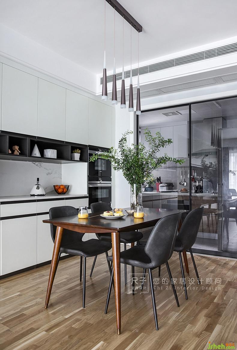 餐廳沿用了最初的黑白灰構(gòu)想,進(jìn)深600mm的餐邊柜收納功能強(qiáng)大,這里不僅是實(shí)用備餐區(qū),還可作為小西廚。