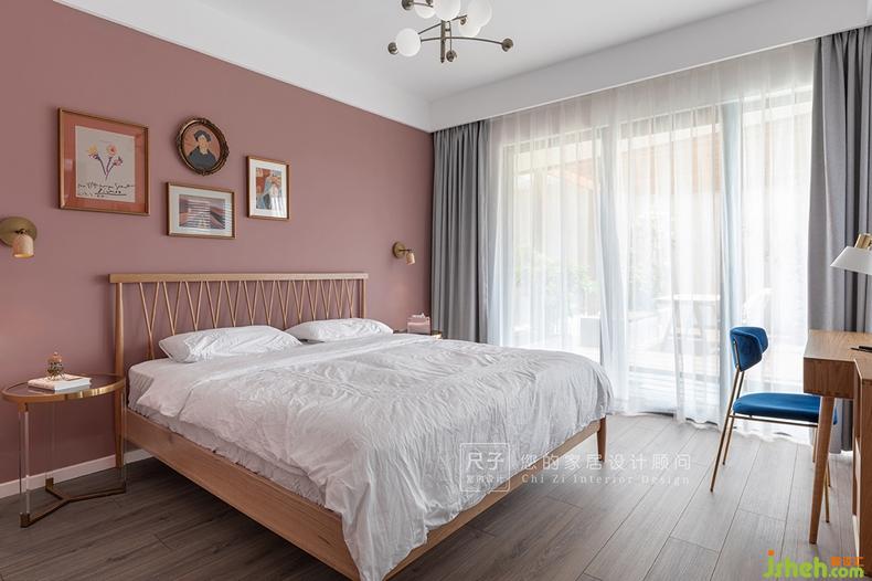 主臥依然沿用臟粉為主色,線條走向嚴(yán)謹(jǐn)簡潔的溫莎床,交錯的靠背,既有北歐日式的簡約樸素,又不失淡淡禪意。
