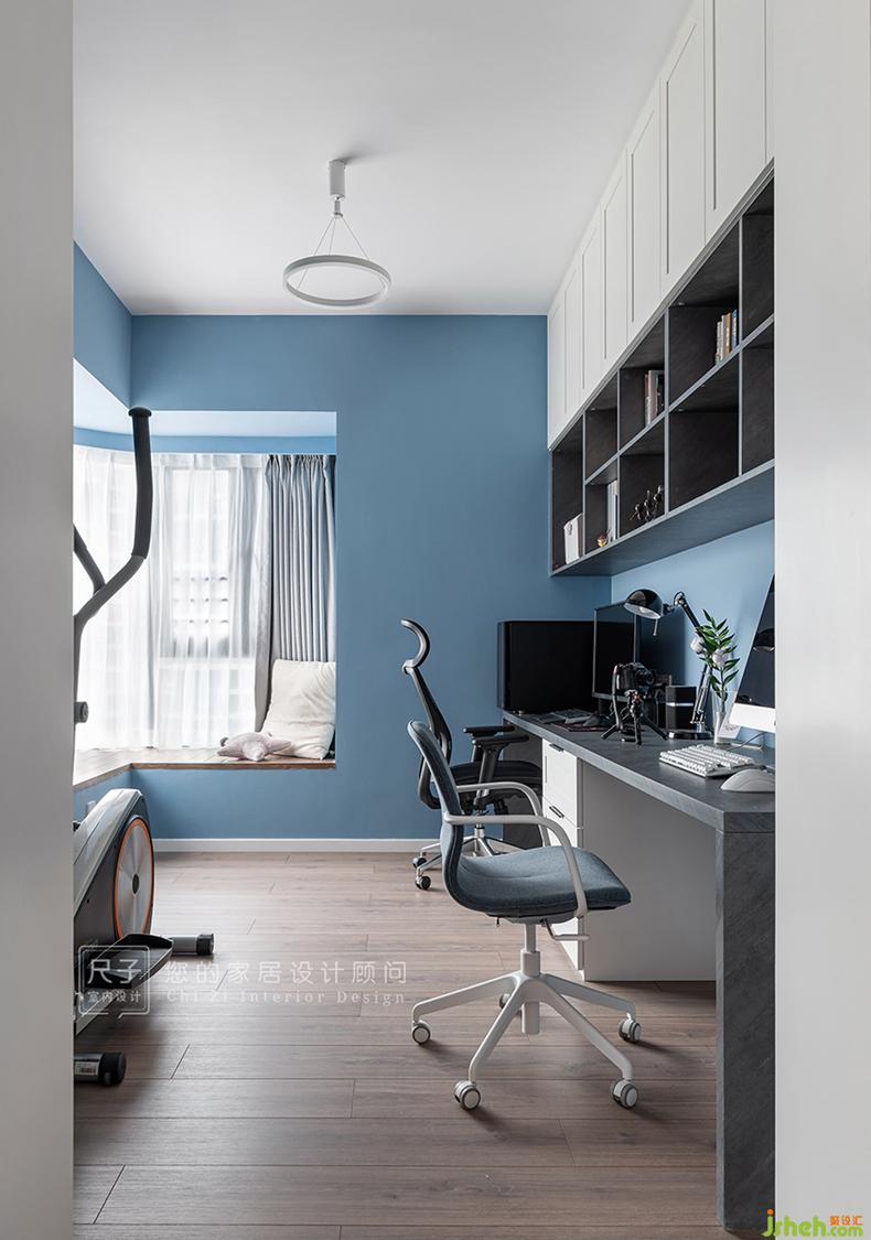 書房以沉穩(wěn)的藍(lán)色作為墻面打底,與一襲自然的木地板承載著空間內(nèi)所有物件,這里是一個可以靜心思考的地方.