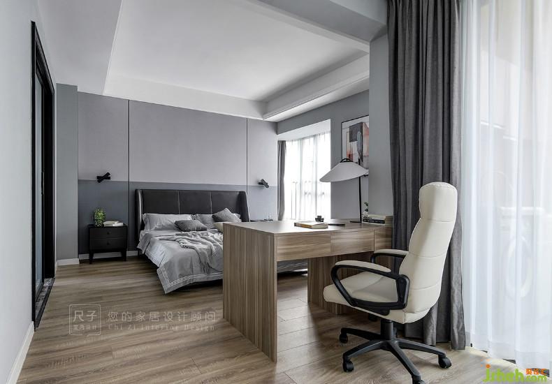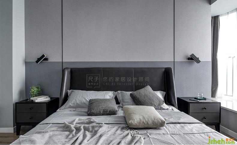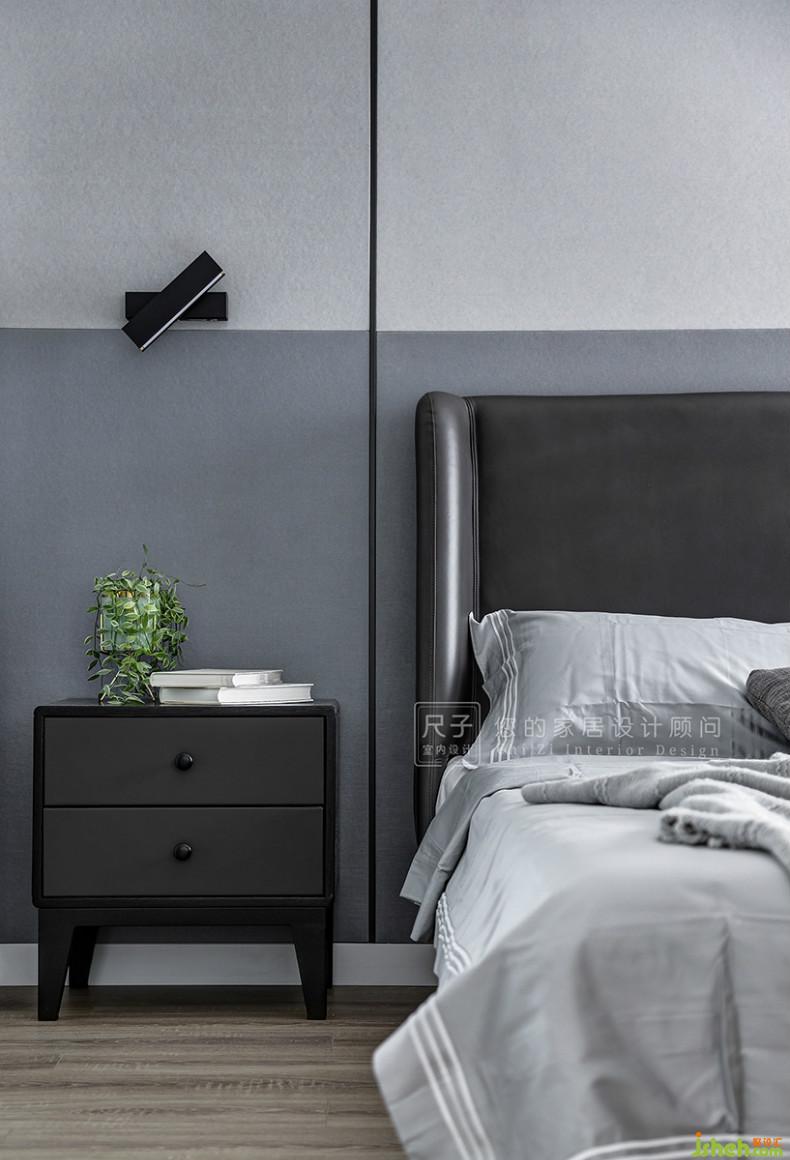 灰色硬包床頭背景彰顯著空間的品質感,不同明度的分色設計點綴出空間層次。