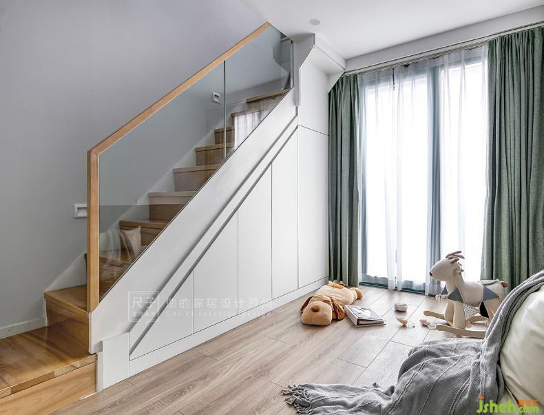 樓梯下的空間當然也不能浪費,根據樓梯的層層遞進,其下方空間和定制的儲物柜相結合,將雜物統(tǒng)統(tǒng)收納其中;無拉手的柜子和樓梯融為一體,為視覺帶來一片清爽。