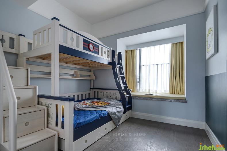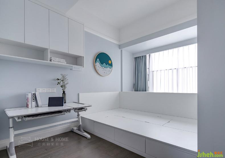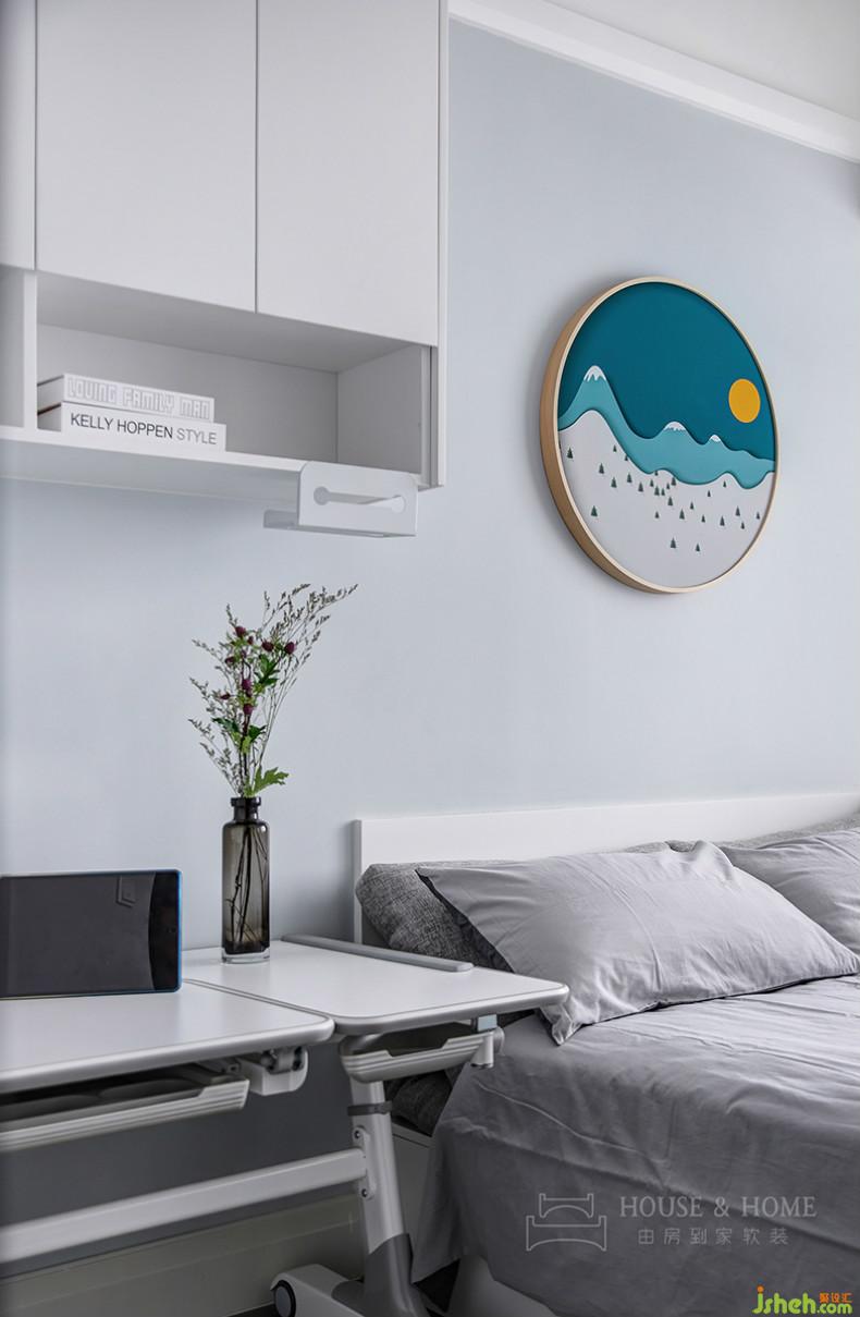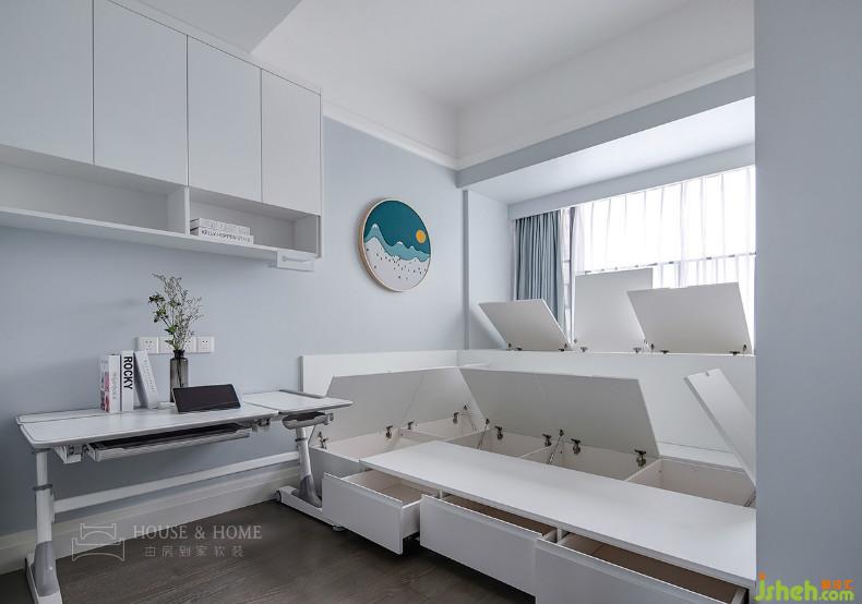 目前孩子年紀(jì)尚小暫不考慮分房睡,因此選用高低床。孩子成長的不同階段,他們的的生活需求也會(huì)有所變化,室內(nèi)設(shè)計(jì)師在右側(cè)留白出大片空間,留待主人慢慢添加。