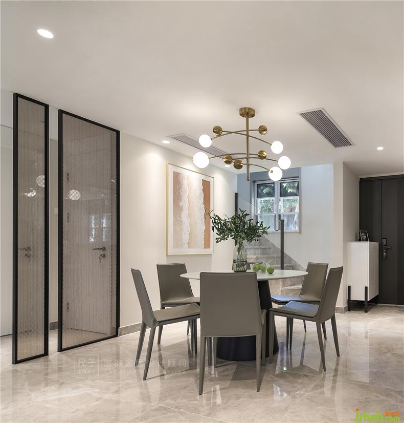 巖板圓桌搭配皮質(zhì)餐椅,不規(guī)則造型燈具打破束縛,讓圍合式的空間有了更多層次變化。室內(nèi)設(shè)計(jì)師