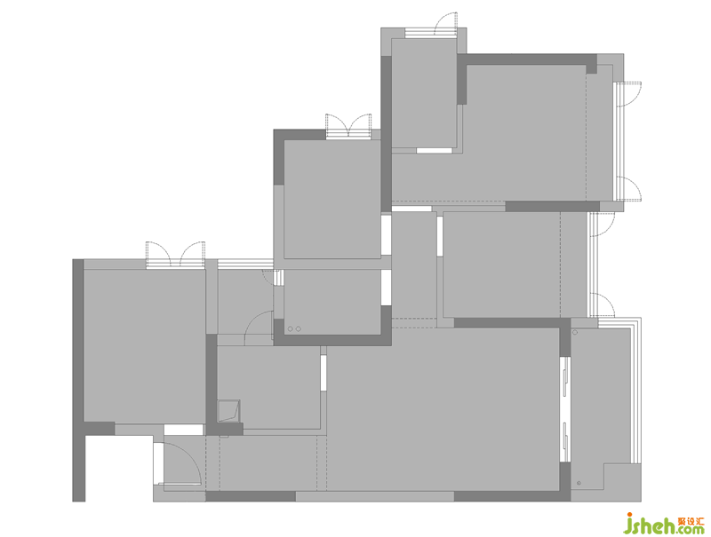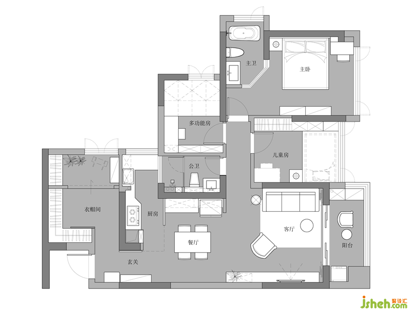 ③主衛(wèi)更改原本的門洞位置,避免開門正對衛(wèi)生間,并用通透的玻璃門做斜角處理,大大增加采光面