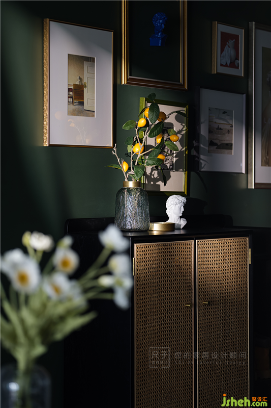 玄關(guān)處的暖色燈光為家居配飾打造出一個獨特的舞臺,松綠花瓶與檸檬果靜立在藤編鞋柜上,與不同色彩的掛畫組合,演繹一場萬種風(fēng)情的戲曲。