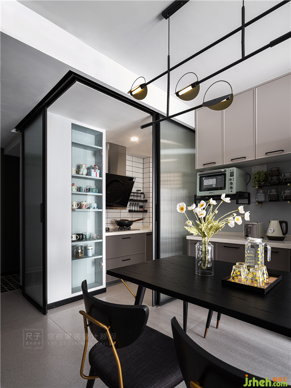 黑框玻璃推拉門不僅顏值在線,也能充當(dāng)著實用的空間隔斷,清晰界定出餐廚兩個功能區(qū);玻璃材質(zhì)特有的通透感,卻也為兩個空間建立了親密的聯(lián)系。