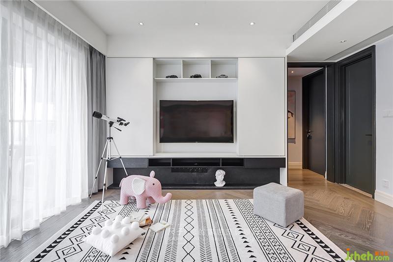 客廳電視柜和書柜結(jié)合,推拉柜門的設(shè)計(jì)可以讓電視可以藏起來,給孩子一個(gè)良好的閱讀環(huán)境。