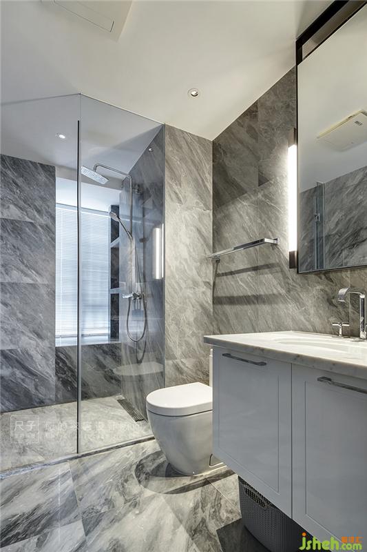衛(wèi)浴間的墻面和地面通鋪灰色大理石,淋浴區(qū)以透明玻璃門隔斷,做到干濕分離,通透明亮。